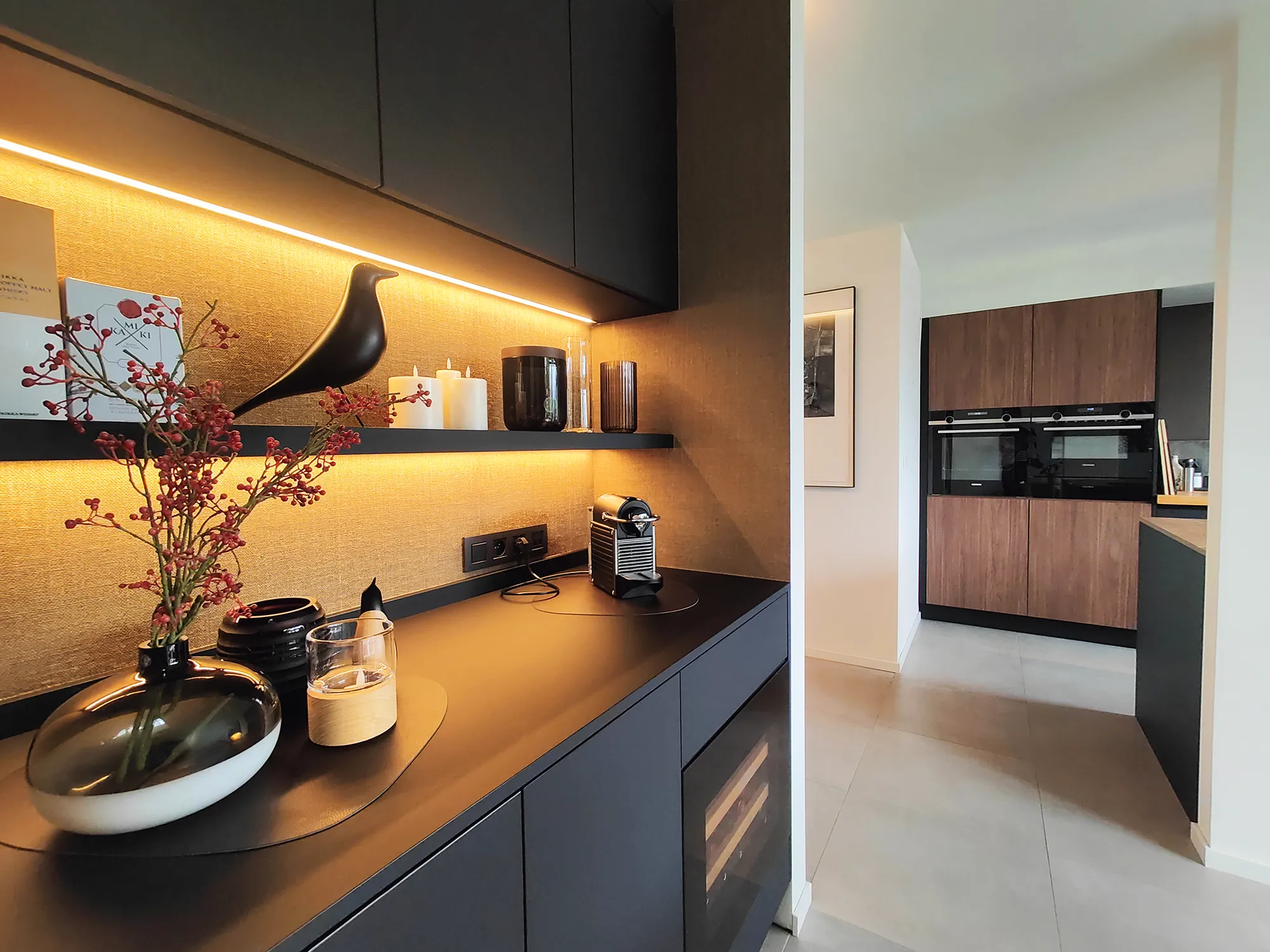 In de volledig uitgeruste keuken spelen natuurlijke houtnerven en zwarte fronten op elkaar in. Het ruime keukeneiland is niet alleen een blikvanger, maar zorgt ook voor heel wat praktische werkruimte. De kers op de taart? De geïntegreerde koffiehoek, waar ze overdag genieten van een vers kopje koffie en ’s avonds van een glas wijn uit de ingebouwde wijnkoelkast.